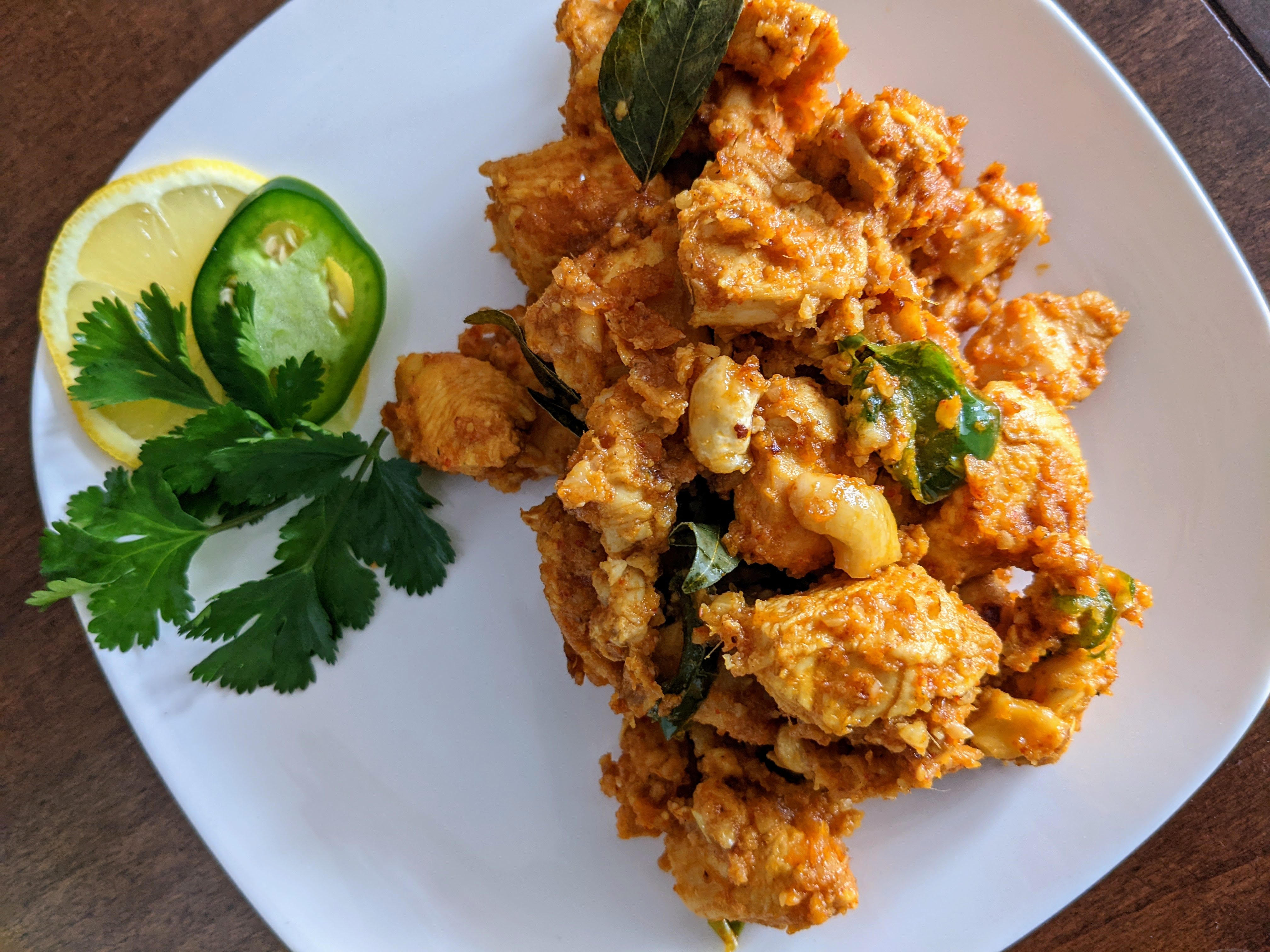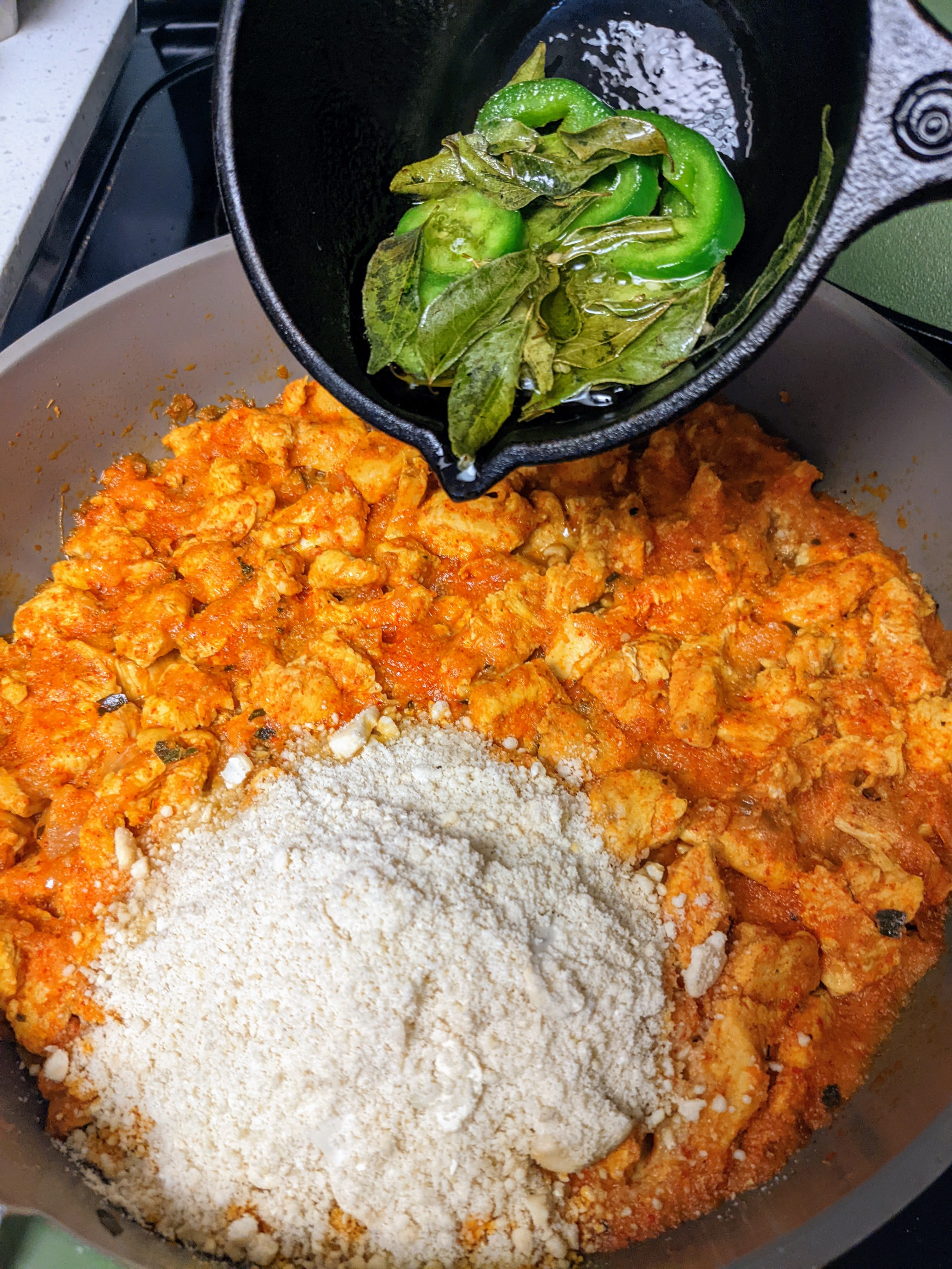 Turn off the gas and add the remaining curry leaves and add this to the chicken. Add cashew powder to the chicken as well.
