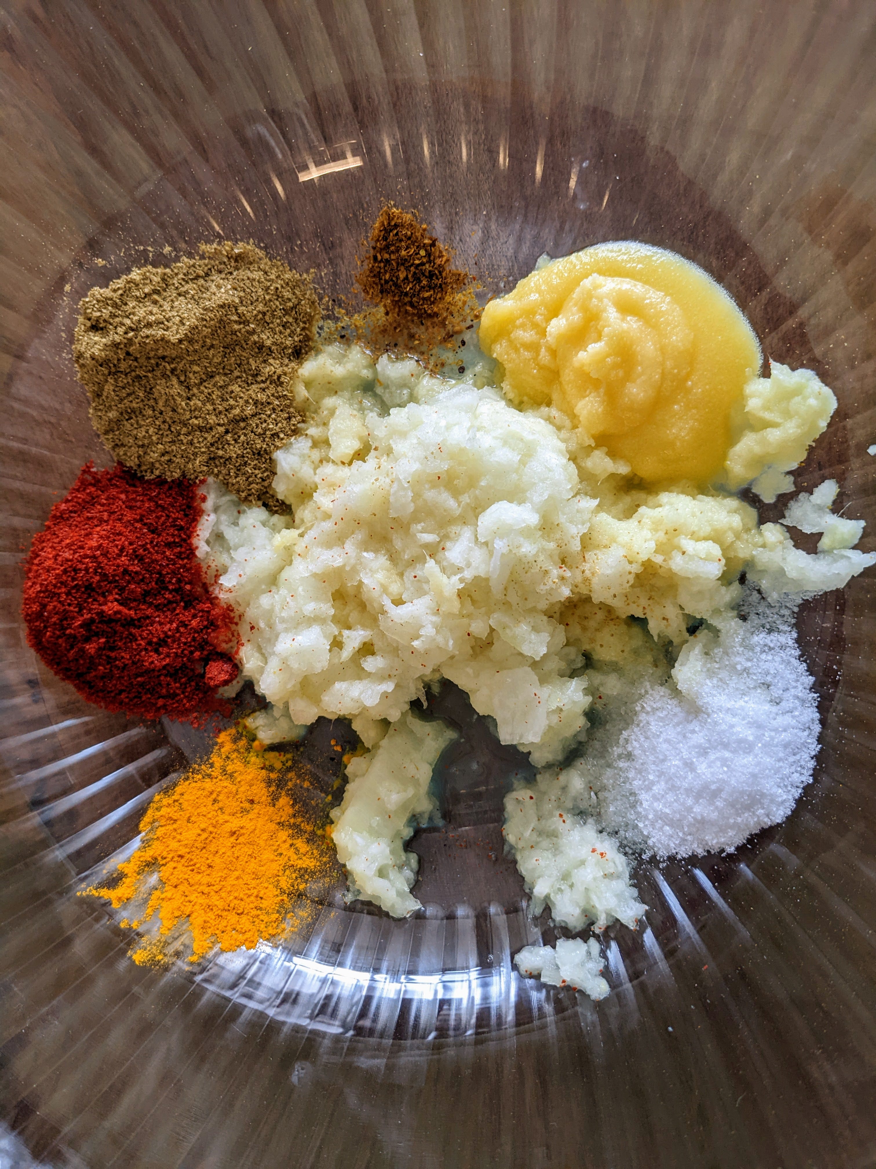I add the onion to the grinder jar in which I have prepared my ginger-garlic paste and pulse a few times. Consistency close to chopped onions work better than onion paste for this recipe.