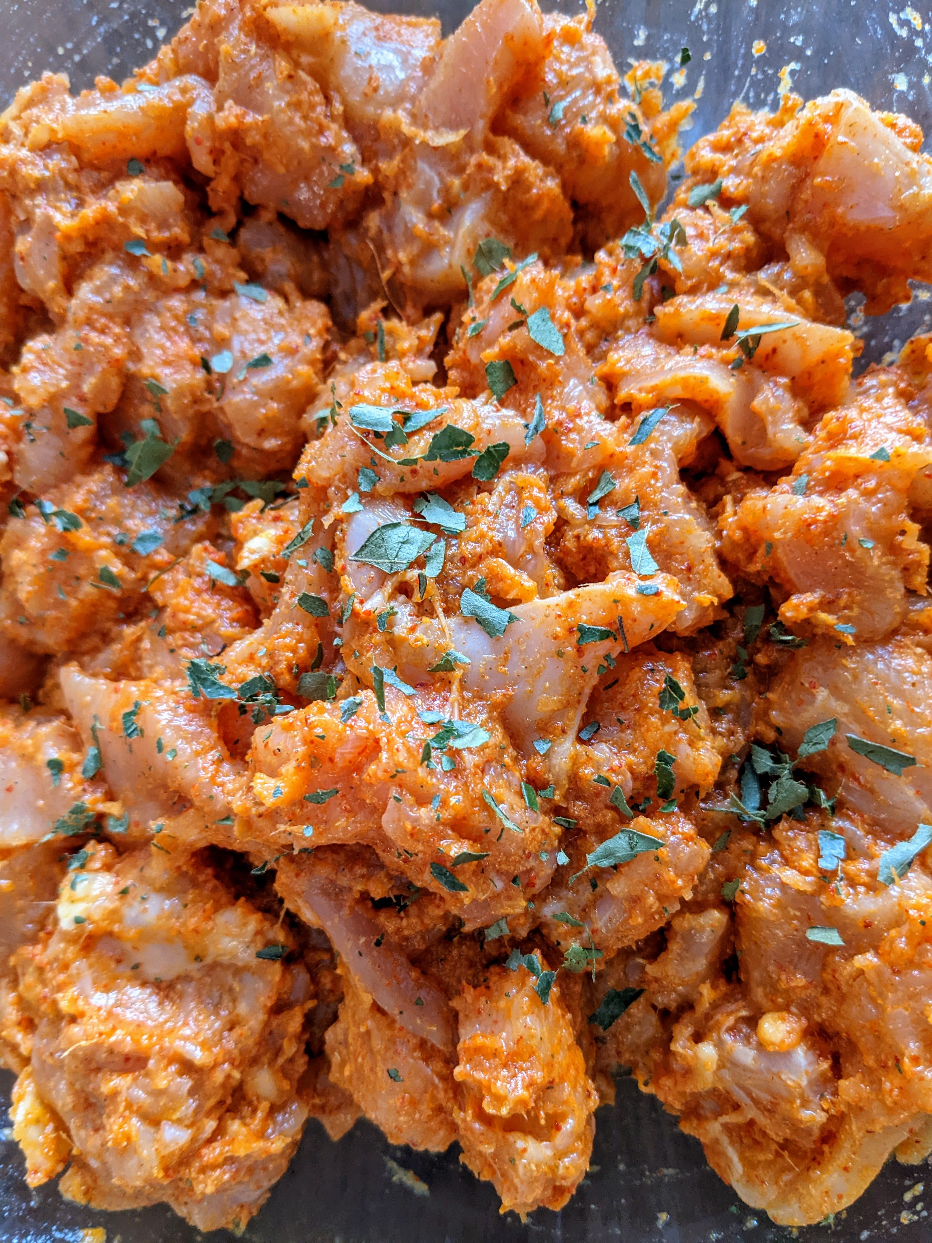 The ingredient that stands out in Andhra cuisine is the curry leaves. The green chillies and curry leaves tarka(tempering) instantly makes the dish impossible to resist. The tempering adds all the magic in this chicken tikka recipe as well. This is my go-to weekend chicken recipe when I want to eat something delicious. It perfectly fits the lifestyle and is quick enough to make, so that I don’t have to spend a lot of time in the kitchen.