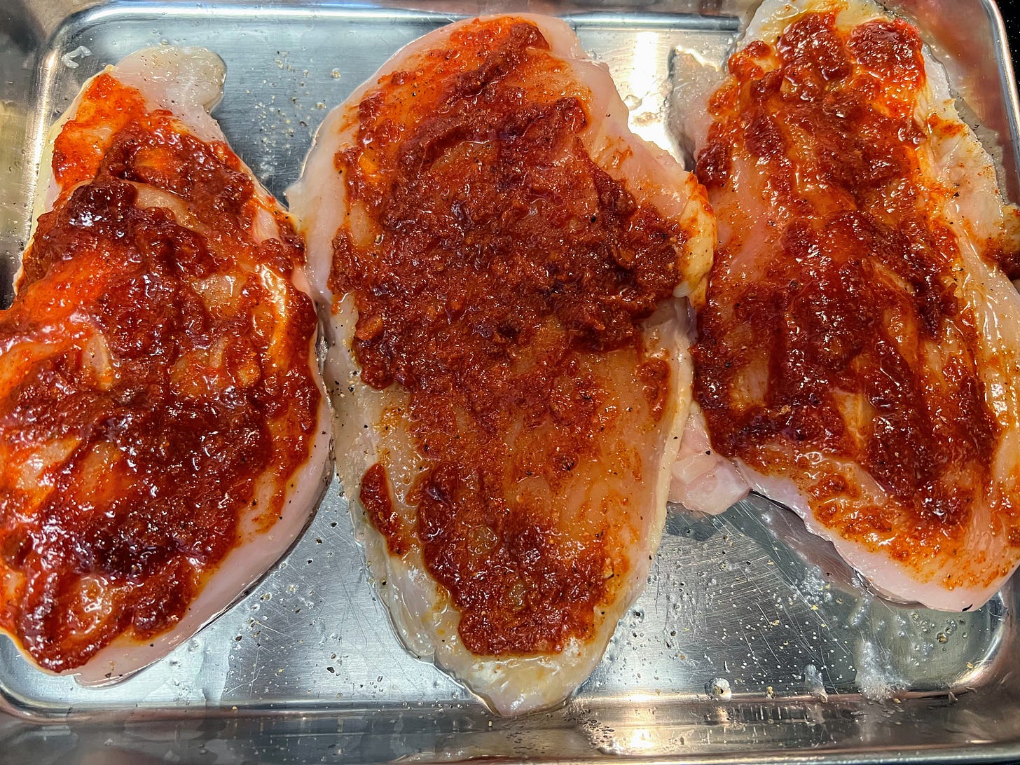 Generously apply BBQ sauce to the chicken, only one side should be enough. Drizzle some olive oil on top.