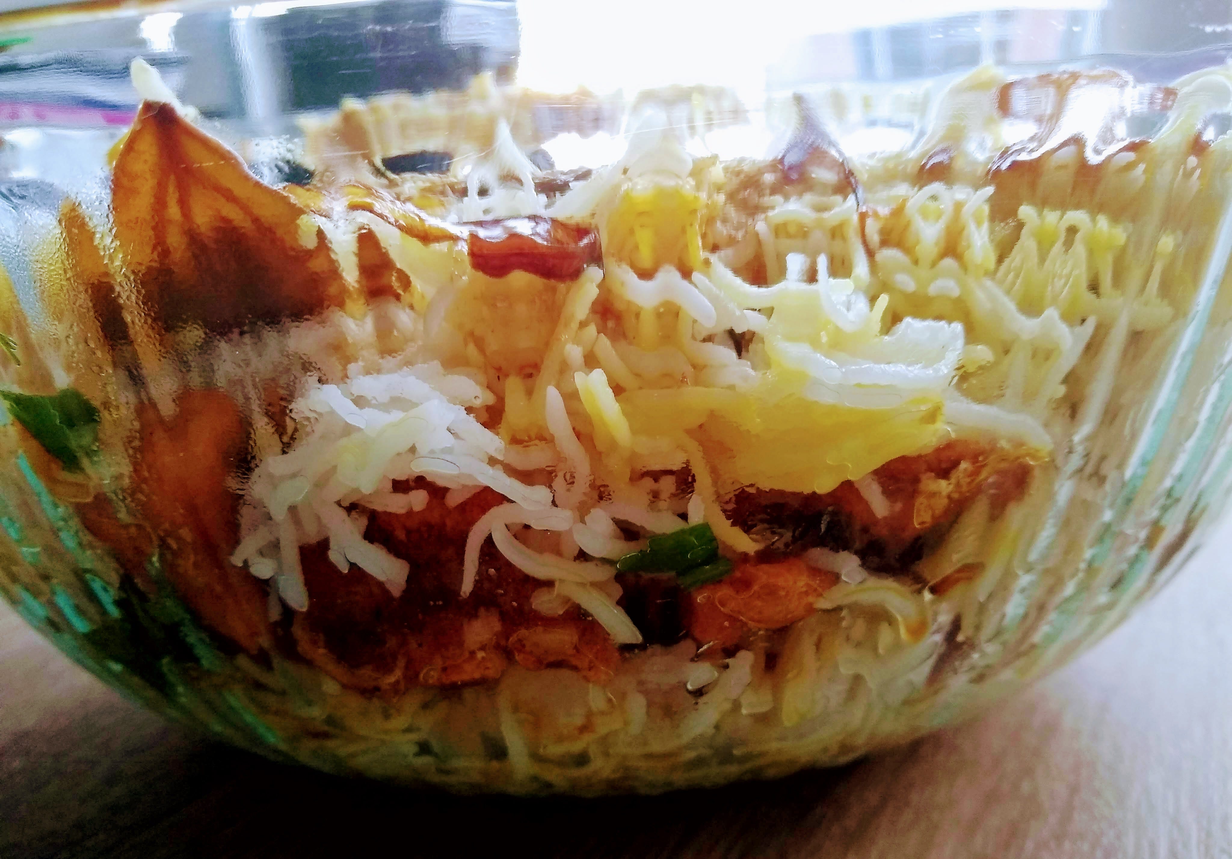 Now it’s time to assemble the biryani! In a serving bowl, add a layer of half the prepared rice, chopped mint and cilantro, as well as all the remaining fried onions. Spread the saffron milk, rose and kevra water if using on the rice. Add all the prepared chicken gravy and spread the yoghurt on the gravy. Cover this layer with another layer of rice.